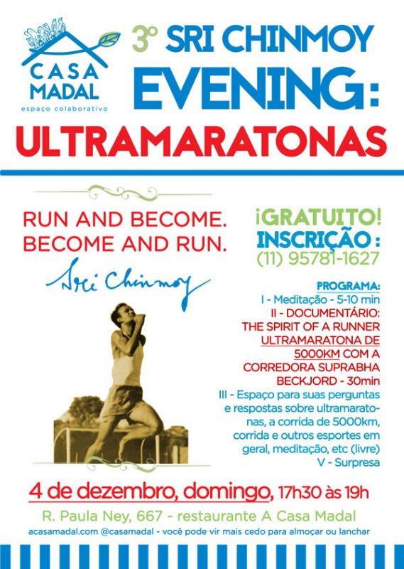 Se quiserem ver mais sobre a meditação e esportes, tem um filme feito por uma cineasta americana com uma discípula de Sri Chinmoy que correu a maior corrida do mundo, de 5000km, com tempo de corte de 52 dias. Chama-se “O espírito de uma corredora.”