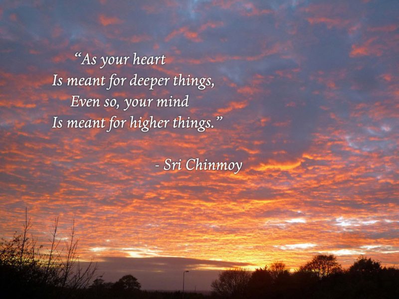 Sri Chinmoy: Tente sentir que você não tem mente, mas sim alma. Se não conseguir sentir a presença da sua alma, ainda assim poderá facilmente sentir a presença do seu coração. Deixe que a Luz do seu coração percorra o seu ser por completo. Quando isso acontecer, saiba que transcendeu a mente intelectual, racional, e entrou na mente iluminada.